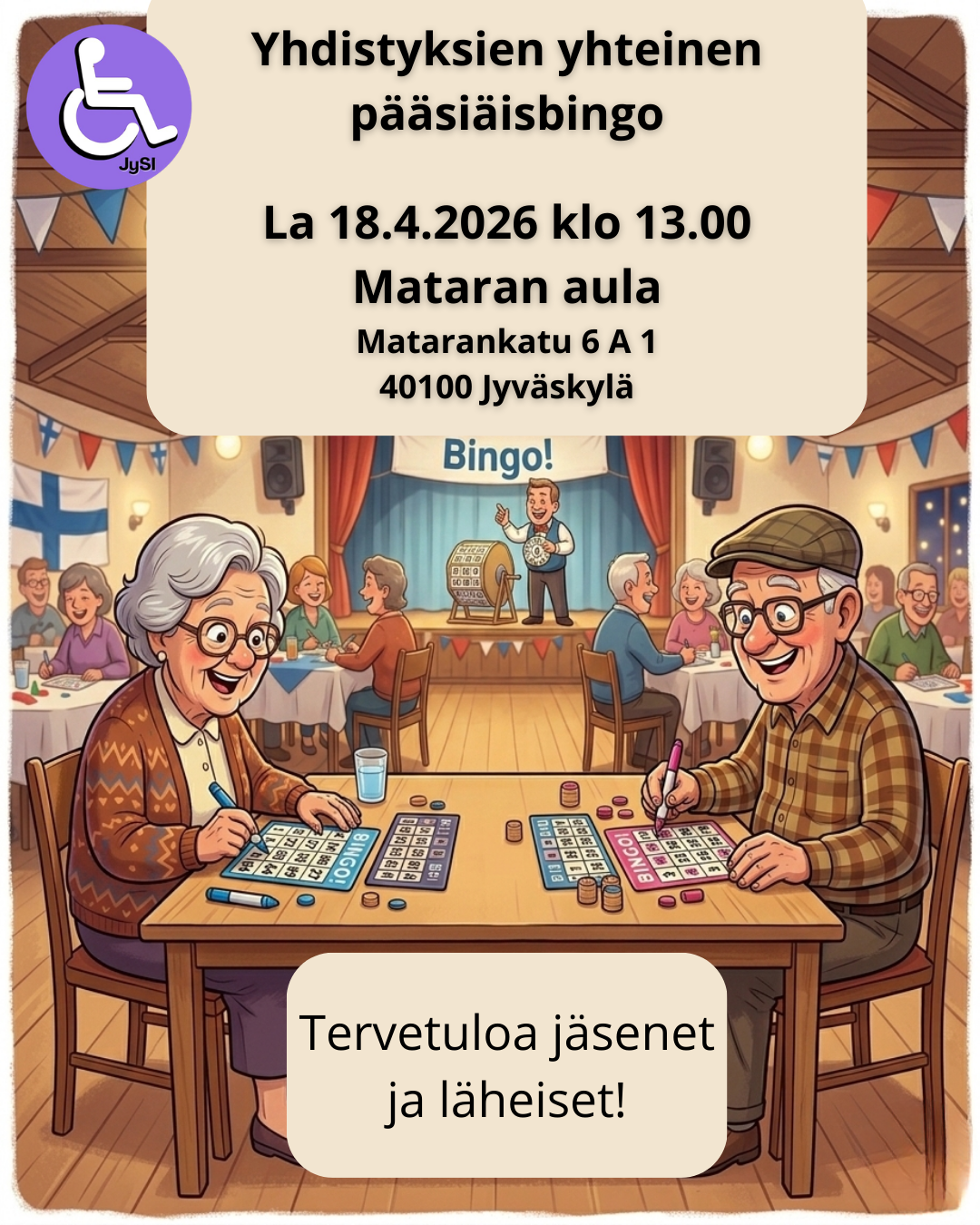 La 18.4.2026 klo 13 Mataran aula Matarankatu 6, 40100 Jyväskylä Tervetuloa Jäsenet ja läheiset!