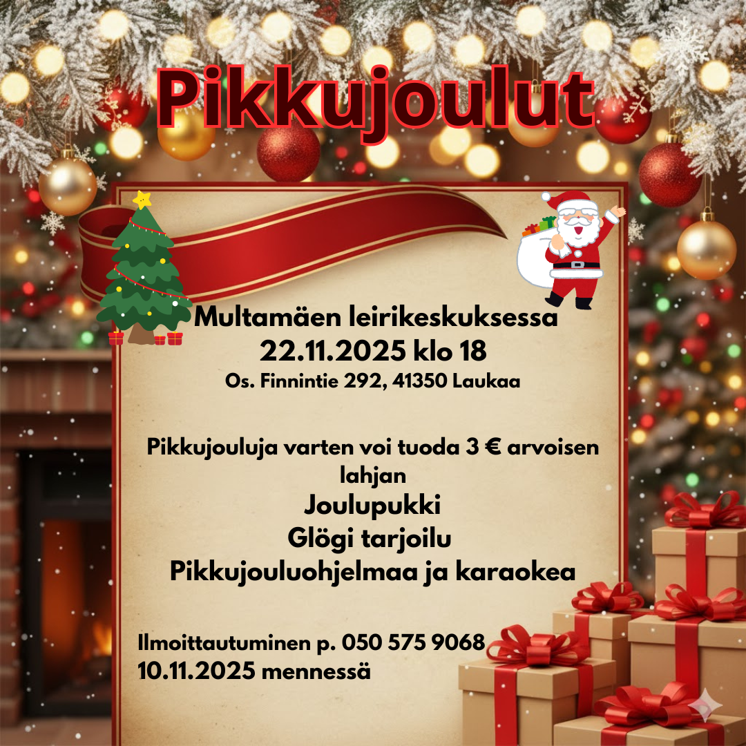 Pikkujoulut Multamäen leirikeskuksessa 22.11.2025 klo 18 Os. Finnintie 292, 41350 Laukaa (Samana päivänä kuin yhdistyksemme aktiivipäivä!) Pikkujouluja varten voi tuoda 3 € arvoisen lahjan Joulupukki…
