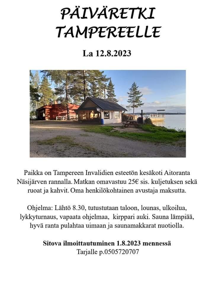 RELa 12.8.2023 Päiväretki Tampereen Seudun Invalidien kesäkodille Aitorantaan. Paikka sijaitsee Näsijärven rannalla ja on esteetön.